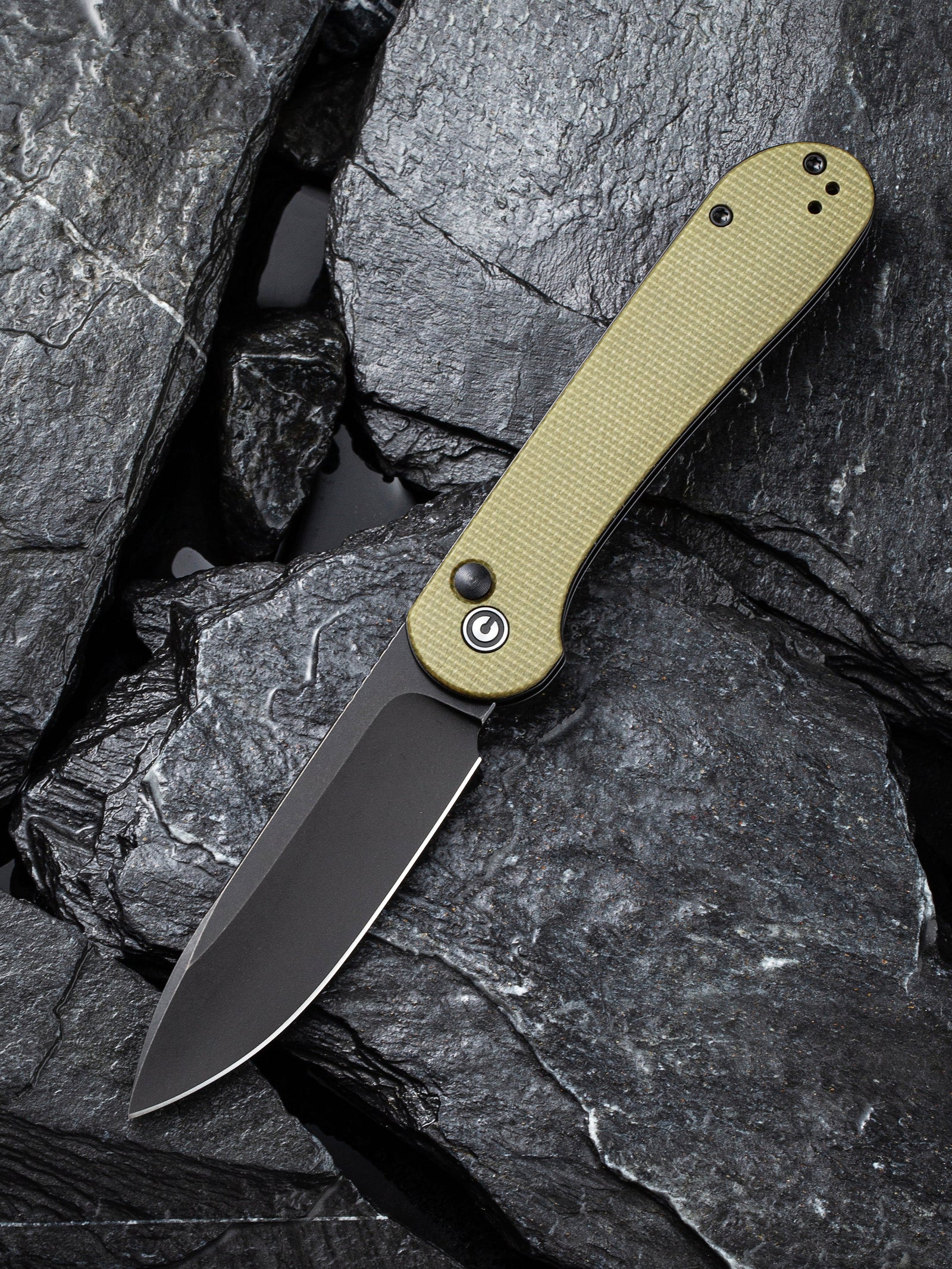 $51.00 USD $59.00 USDCIVIVI Button Lock Elementum | Olive Micarta Handle Black S/S Liner Black Stonewashed 14C28N Blade