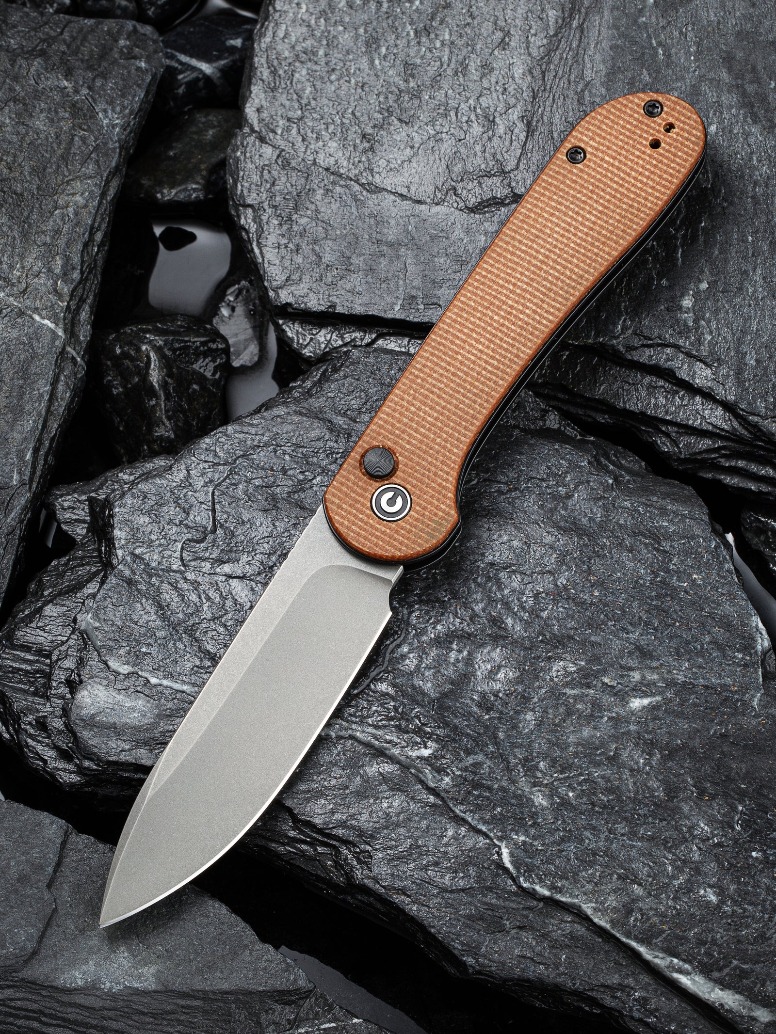 $75.00 USD $87.65 USDCIVIVI Button Lock Elementum | Brown Micarta Handle Black S/S Liner Gray Stonewashed 14C28N Blade