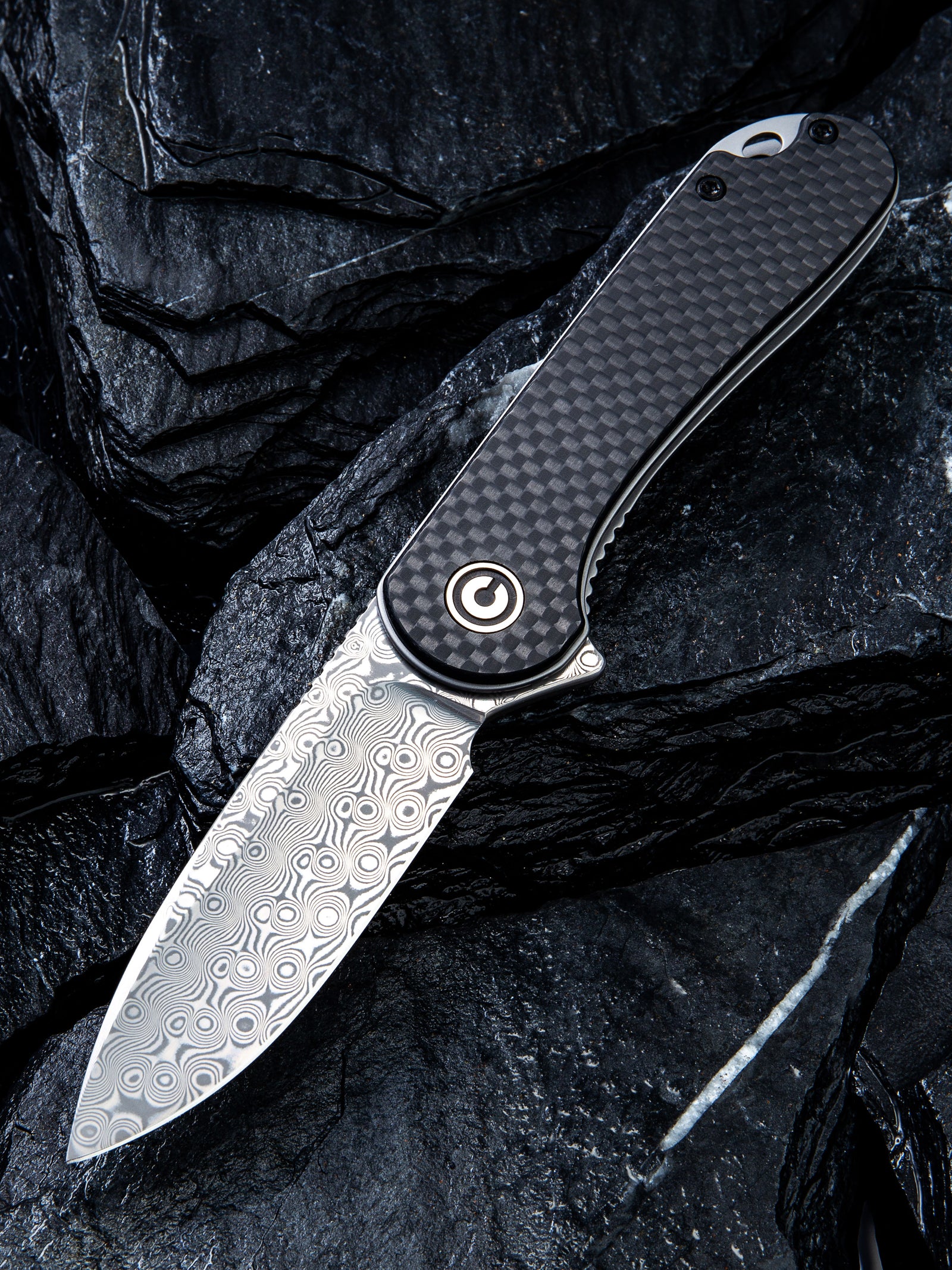 Sold OutCIVIVI Elementum | Twill Carbon Fiber Overlay On Black G10 Handle Gray S/S Liner Damascus Blade