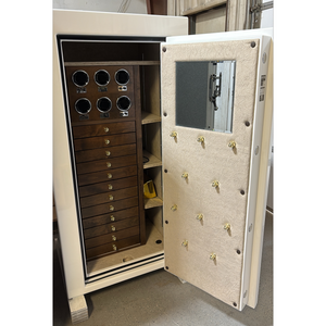 This Marquise 6031 features a Bright White gloss finish, classic gold pinstriping, gold hardware, an S&G E-Lock, and right swing external hinges. On the inside, this safe features a large 12 drawer jewelry cabinet, 6 powered watch winders, and additional space for other valuables finished out with sand velour cloth. The inside of the door has a mirror along with multiple pegs for hanging necklaces or other items. Accessories include upgraded graphics, corner locking bolts, finial pull handle, LED light kit, and a dehumidifier.